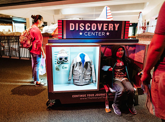 The Bob Bullock Texas History Museum, located in downtown Austin, Texas, was looking for an innovative and interactive way to get young kids involved and learning when visiting the museum. Six carts were concepted and designed to be cohesive yet customizable; each having it's own themed design and style according to the particular exhibit area they would be featured in. From Childhood in the early 1900's, Cowfolk, Trains, Planes, to Sailors, children and their families can physically interact with actual artifacts, watch relevant videos, and participate in activities to get a more memorable, hands on experience. There is even an Discovery Center cart designed to greet visitors as they enter the museum to engage children and families at the beginning of their journey through the museum as well as explain museum etiquette to children.
